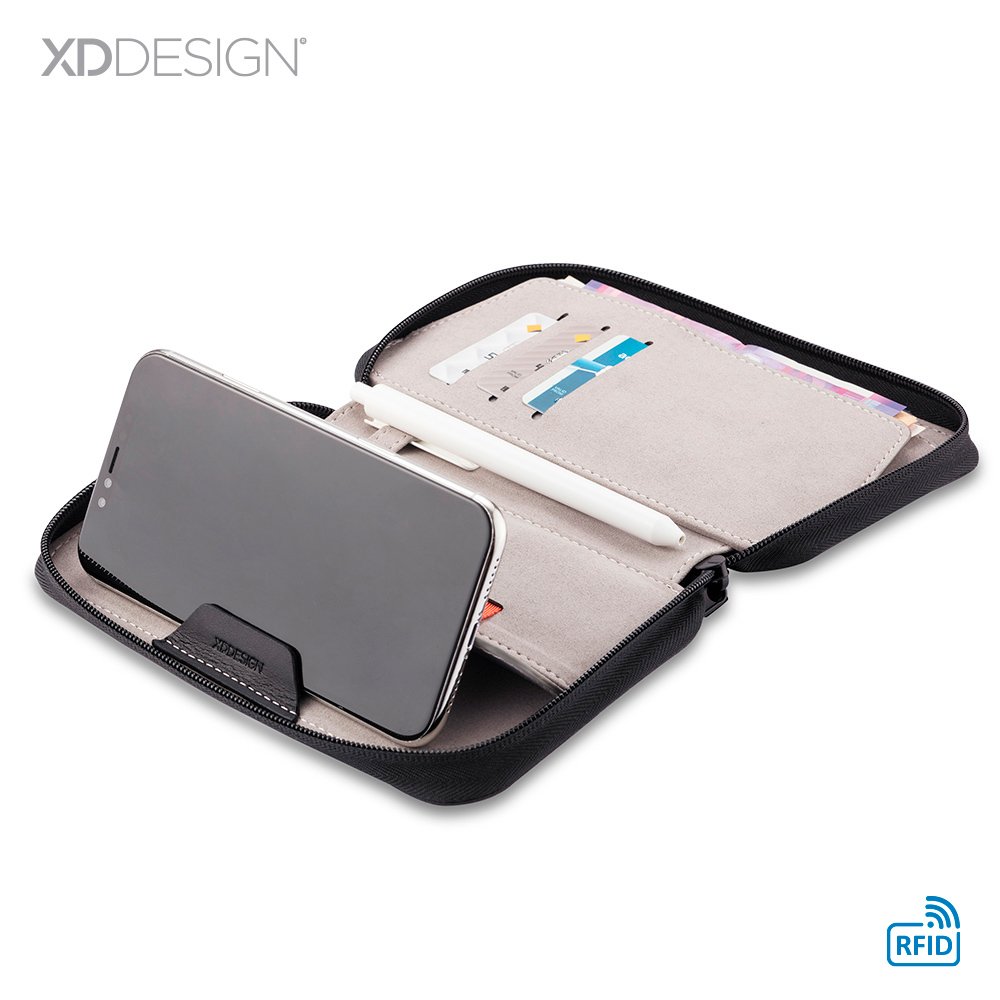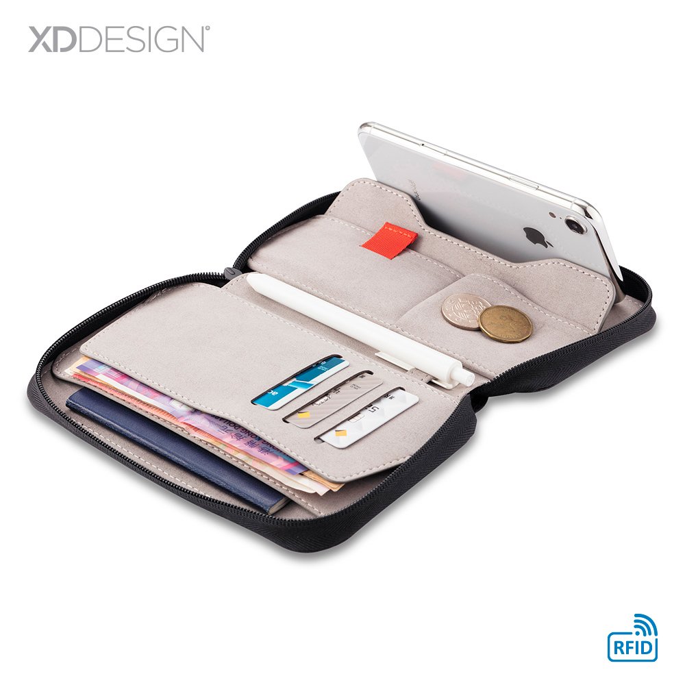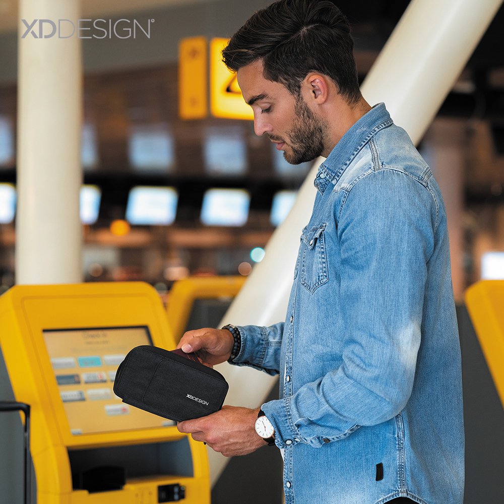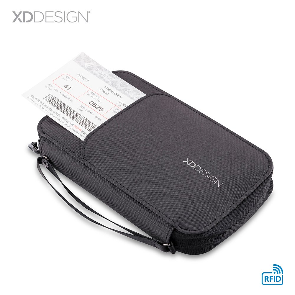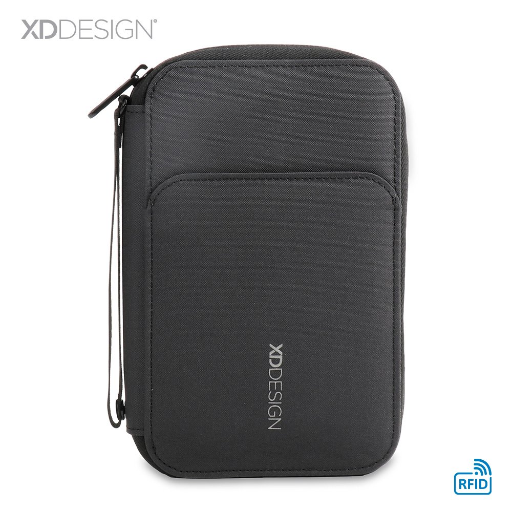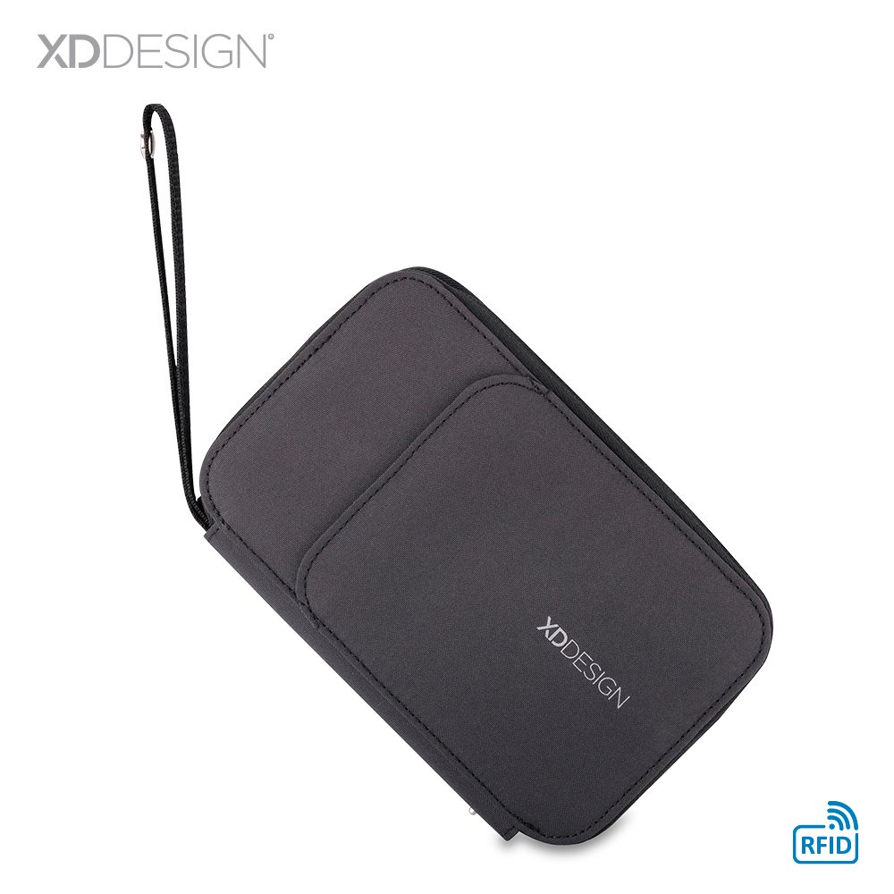 Portadocumentos en lona poliéster RPET, bolsillo exterior con cierre de imán. Su material interno permite bloquear las señales electromagnéticas RFID (Radio Frequency Identification) que se usan en tarjetas de chip, pasaportes, tarjetas electrónicas de transporte, etc. Empaque caja individual.