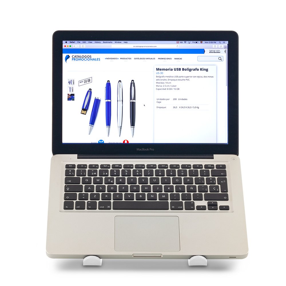 Soporte Portátil Plegable plástico. Ligero, con ajuste de altura en la parte posterior y puntas antideslizantes. La posición del dispositivo sobre el soporte ayuda a que no se recaliente, mejora la posición de la columna vertebral y reduce la fatiga de cuello, espalda y ocular. Se sugiere usar en dispositivos entre 10 y 15 pulgadas. Con funda para cargar y caja individual.
